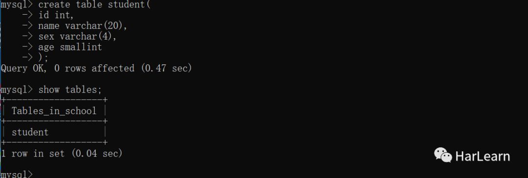 table_name 是我们要创建表格的名字,属性名 数据类型指定列的名字和数据类型,每列之间使用 , 分隔。下面我们在 school 数据库中创建一个 student表。通过 show tables; 显示 school 数据库中表。