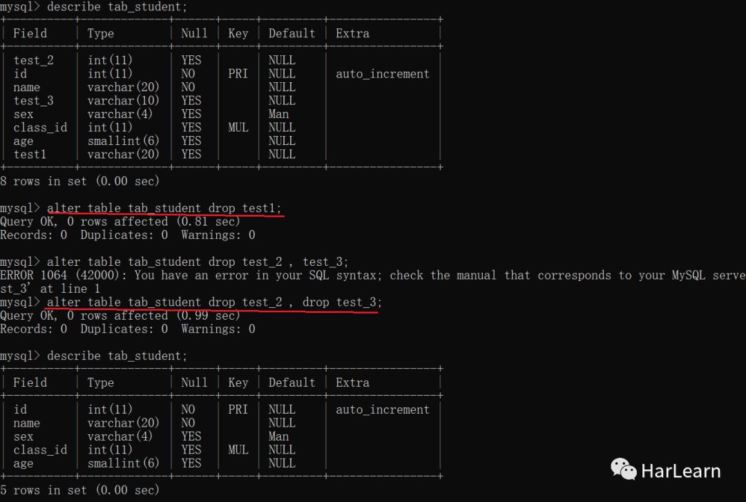 alter table tab_student drop test_2 , drop test_3;
