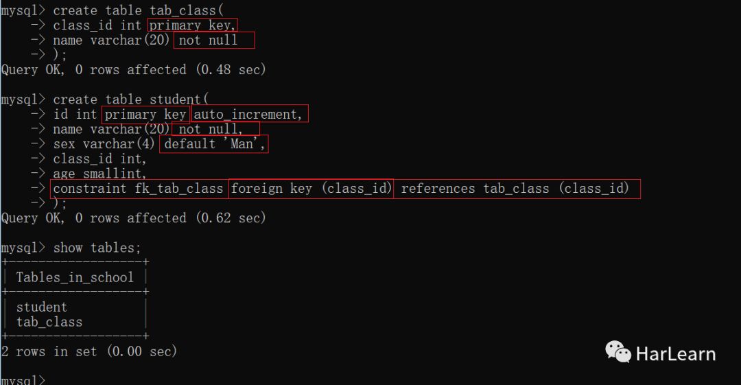 create table student( id int primary key auto_increment, name varchar(20) not null, sex varchar(4) default 'Man', class_id int, age smallint, constraint fk_tab_class foreign key (class_id) references tab_class (class_id));