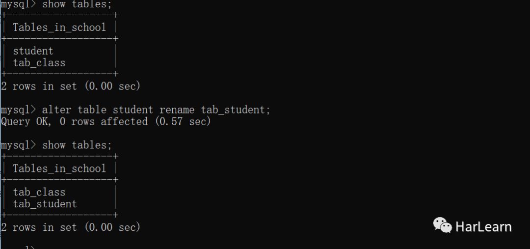 为了使表名能够见名知意,通常把表名以t_或 tab_ 开头,下面我们把student表的名字修改为 tab_student。其基础语法alter table old_name rename new_name;代码如下:
