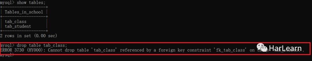 注意: 我们在school数据库中创建了两张表 tab_class和tab_student ,它们通过主外键建立了约束,所以在删除时是有顺序的,需要先删除tab_student表,再删除 tab_class表;如果一上来就删除 tab_class 表是会报错。如下: