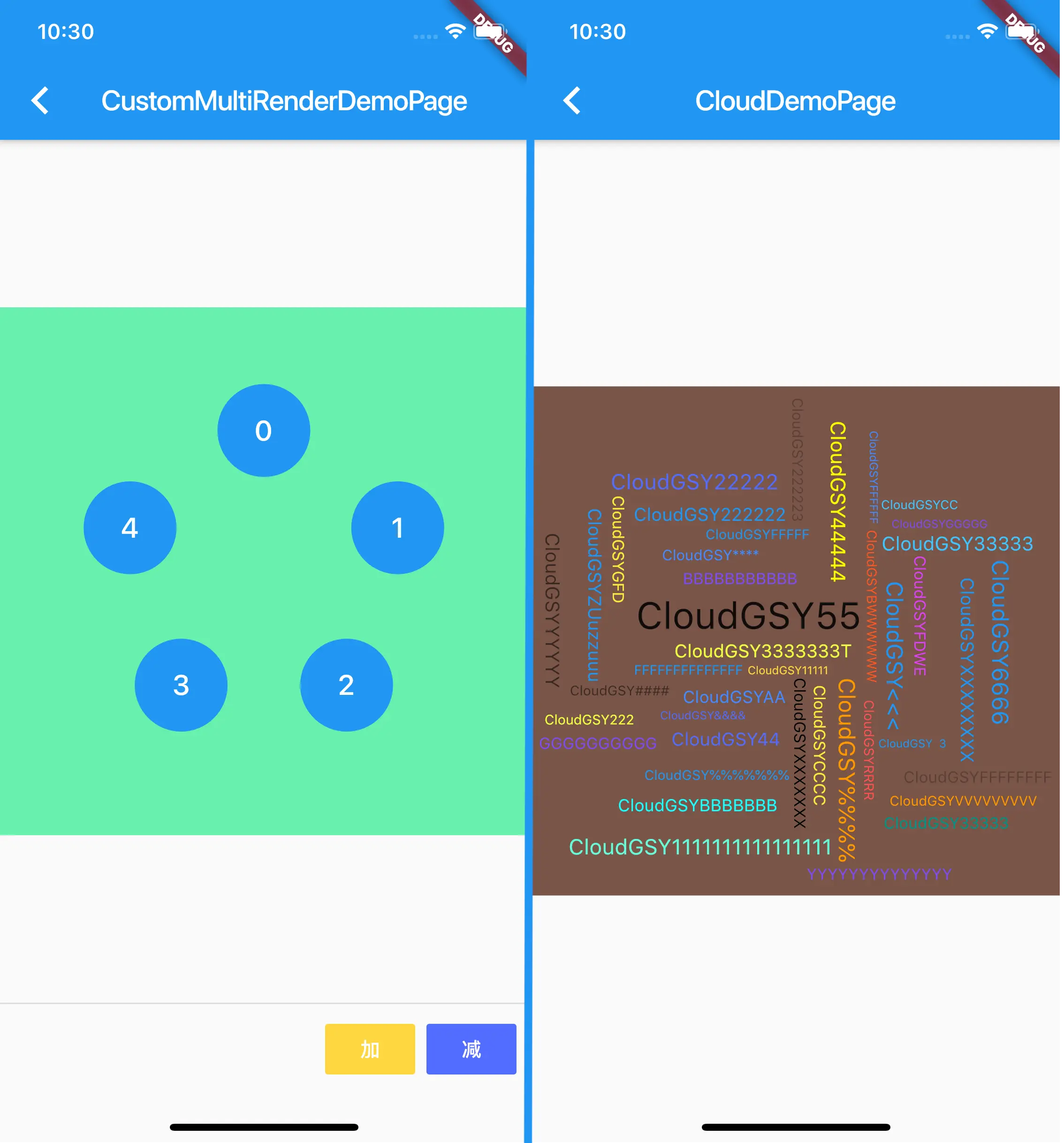 最后通过 CloudWidget 加载我们的 RenderCloudWidget 即可, 当然完整代码还需要结合 FittedBox 与 RotatedBox 简化完成,具体可见 :GSYFlutterDemo