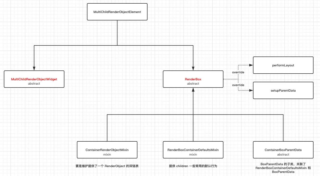 上述主要描述了 MultiChildRenderObjectWidget 、 MultiChildRenderObjectElement 和其他三个辅助类ContainerRenderObjectMixin 、 RenderBoxContainerDefaultsMixin 和 ContainerBoxParentData 之间的关系。