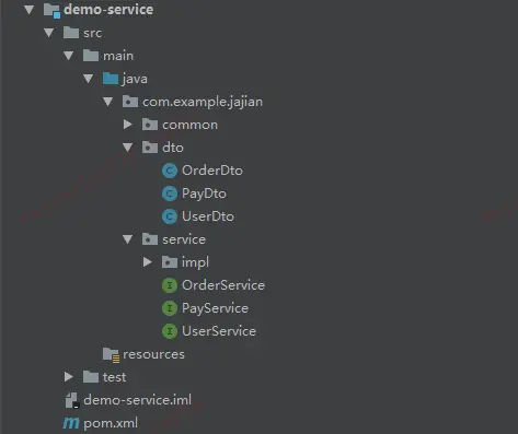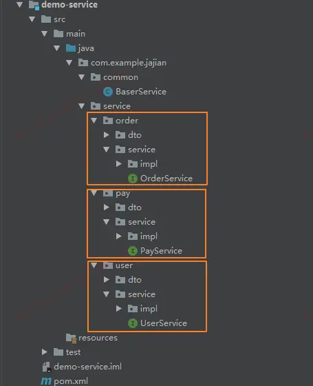 针对上述的两个划分模式,个人的选择是根据业务模式划分,这样的包设计与后期微服务拆分有良好的匹配度,拆分的时候只需要将每个业务包下的代码 Copy 到新的微服务中就行了,易迁移变动小。每个模块中对不同的业务通过 package 包名进行划分,例如:com.example.jajian.service.order、com.example.jajian.service.user等。