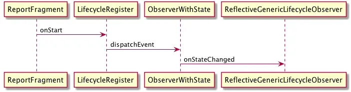 在`ReportFragment`中调用`LifecycleRegister.handleLifecycleEvent(Lifecycle.Event)`,通过**获取事件对应的下一个状态**以及**改变当前状态到下一个状态**,同步分发事件;最后将各个观察者的生命周期状态依次移动到正确状态。
