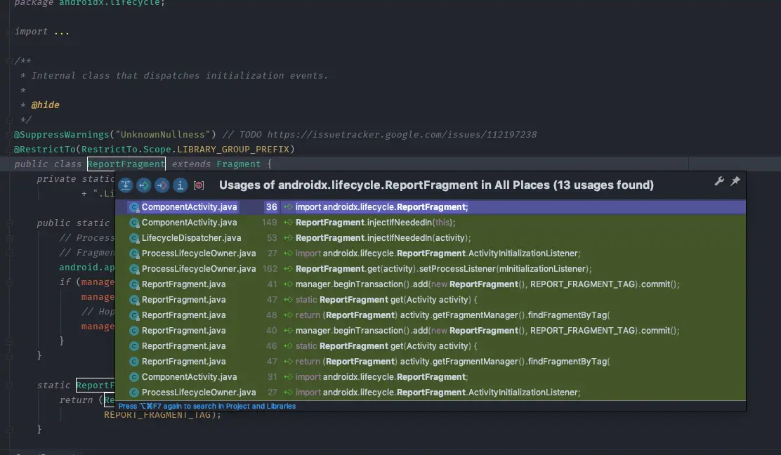 通过代码我们大概能看出来Lifecycles组件是通过观察者模式来实现的,接下来我们具体分析实现原理,我们发现在Activity和Fragment中可以直接通过getLifecycle()方法获取到Lifecycle,那么我们就从这里入手: