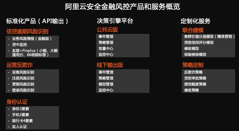 阿里云金融风控解决方案基于阿里系多年业务的实战验证、大量风控专家的行业经验和技术沉淀,真正实现以数据驱动,同时提供功能强大的决策引擎工具,可以帮助用户进行风险的实时分析和决策,并有定制化策略和建模服务,贴合金融机构的业务场景,解决行业痛点。