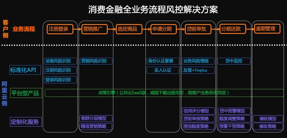 以消费金融业务场景为例,阿里云金融风控服务贯穿业务全生命周期,在不同的业务环节可以用到的产品和服务如下图所示: