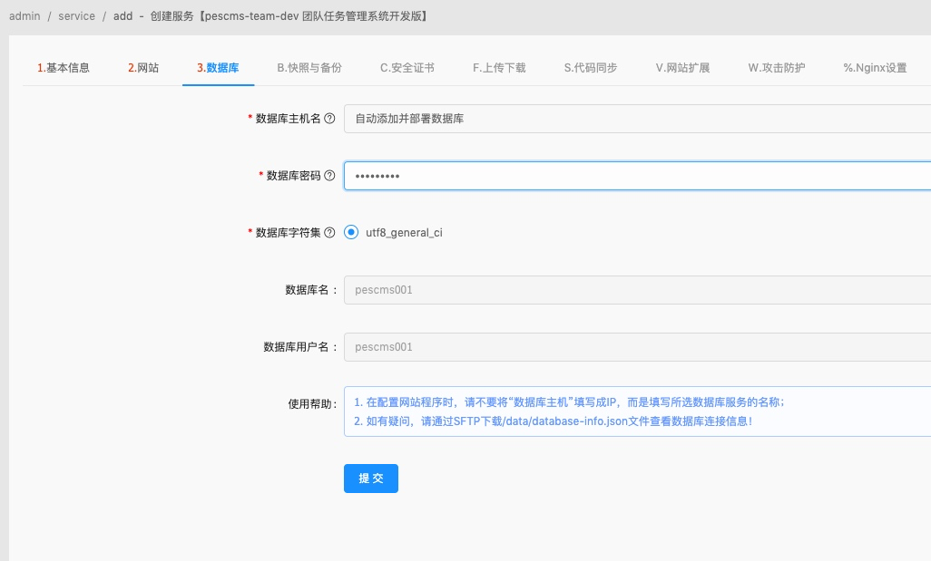 选择自动添加并部署数据库,填写数据库密码; 数据库名和数据库用户名跟前面的服务名称一致,这里已经自动设置好;