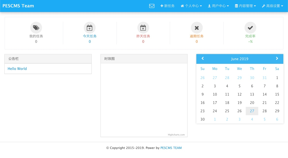 PESCMS TEAM是一款简便的任务管理系统。不主张走复杂的流程管理,记录工作中的任务,减少口头传达的遗忘率,提升工作的紧凑性。所以如果你需要的是一款非常严密的流程任务管理软件,PESCMS TEAM并不合适您。