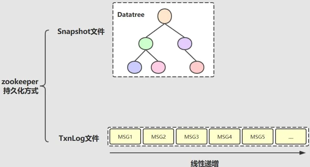 先从zookeeper的数据说起,zookeeper的数据在内存中是以树形结构的datatree形式存在的,采用了两种方式进行数据的持久化,一种是定期的snapshot;一种是增量事务日志txnlog;