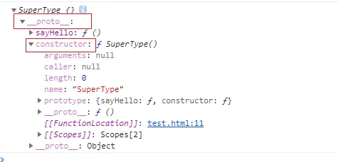 从打印结果我们可以看出,实例对象s1本身并没有constructor属性,而是通过原型向上查找__proto__,共享原型上的constructor属性,该属性最终指向SuperType。