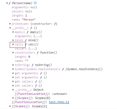 如上述代码所示,Person函数里面没有定义call()方法,为什么Person可以访问call()方法呢?我们把Person打印出来看一下,发现原来是在Person的原型上即Function.prototype上有call()方法可以访问。