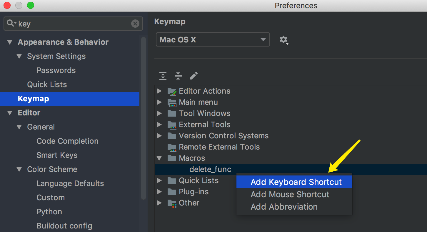 设置好后,查看 Macro,发现PyCharm已经将这个快捷键绑定给这个宏。