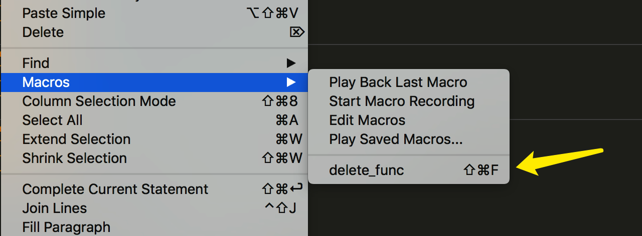 录制好后,你可以先定位到你要删除的函数处,点菜单栏 Edit - Macro 然后选择我们刚刚录制的宏,就可以播放宏了。