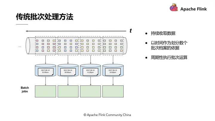 传统批处理方法是持续收取数据,以时间作为划分多个批次的依据,再周期性地执行批次运算。但假设需要计算每小时出现事件转换的次数,如果事件转换跨越了所定义的时间划分,传统批处理会将中介运算结果带到下一个批次进行计算;除此之外,当出现接收到的事件顺序颠倒情况下,传统批处理仍会将中介状态带到下一批次的运算结果中,这种处理方式也不尽如人意。