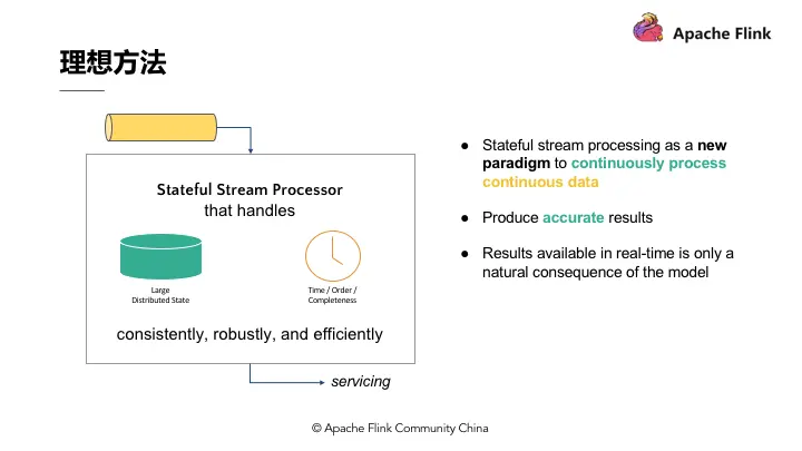 第一点,要有理想方法,这个理想方法是引擎必须要有能力可以累积状态和维护状态,累积状态代表着过去历史中接收过的所有事件,会影响到输出。