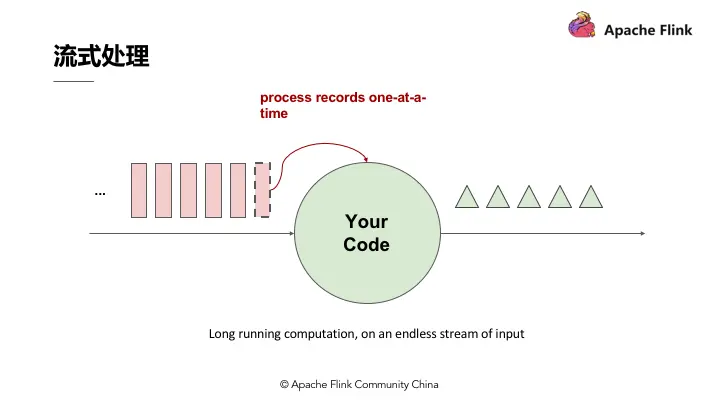 流式处理简单来讲即有一个无穷无尽的数据源在持续收取数据,以代码作为数据处理的基础逻辑,数据源的数据经过代码处理后产生出结果,然后输出,这就是流式处理的基本原理。