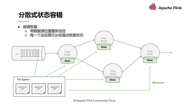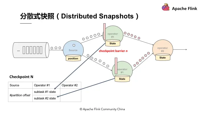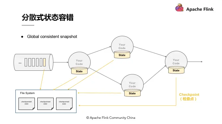 Flink 作为分布式的处理引擎,在分布式的场景下,进行多个本地状态的运算,只产生一个全域一致的快照,如需要在不中断运算值的前提下产生全域一致的快照,就涉及到分散式状态容错。