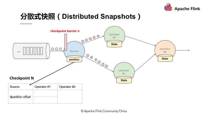 在以上的基础上,当数据源收到 Checkpoint barrier N 之后会先将自己的状态保存,以读取 Kafka 资料为例,数据源的状态就是目前它在 Kafka 分区的位置,这个状态也会写入到上面提到的表格中。下游的 Operator 1 会开始运算属于 Checkpoint barrier N 的数据,当 Checkpoint barrier N 跟着这些数据流动到 Operator 1 之后,Operator 1 也将属于 Checkpoint barrier N 的所有数据都反映在状态中,当收到 Checkpoint barrier N 时也会直接对 Checkpoint 去做快照。