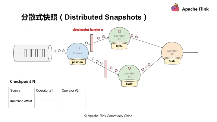 当快照完成后继续往下游走,Operator 2 也会接收到所有数据,然后搜索 Checkpoint barrier N 的数据并直接反映到状态,当状态收到 Checkpoint barrier N 之后也会直接写入到 Checkpoint N 中。以上过程到此可以看到 Checkpoint barrier N 已经完成了一个完整的表格,这个表格叫做 Distributed Snapshots,即分布式快照。分布式快照可以用来做状态容错,任何一个节点挂掉的时候可以在之前的 Checkpoint 中将其恢复。继续以上 Process,当多个 Checkpoint 同时进行,Checkpoint barrier N 已经流到 job manager 2,Flink job manager 可以触发其他的 Checkpoint,比如 Checkpoint N + 1,Checkpoint N + 2 等等也同步进行,利用这种机制,可以在不阻挡运算的状况下持续地产生 Checkpoint。