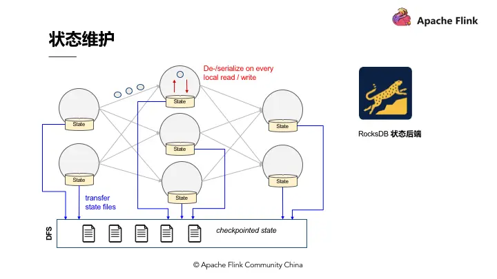 - RocksDB 状态后端,它是一种 out of core 的状态后端。在 Runtime 的本地状态后端让使用者去读取状态的时候会经过磁盘,相当于将状态维护在磁盘里,与之对应的代价可能就是每次读取状态时,都需要经过序列化和反序列化的过程。当需要进行快照时只将应用序列化即可,序列化后的数据直接传输到中央的共享 DFS 中。