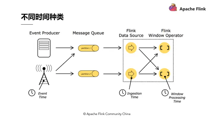 Time,分为 Event time、Ingestion time、Processing time,Flink 的无限数据流是一个持续的过程,时间是我们判断业务状态是否滞后,数据处理是否及时的重要依据。