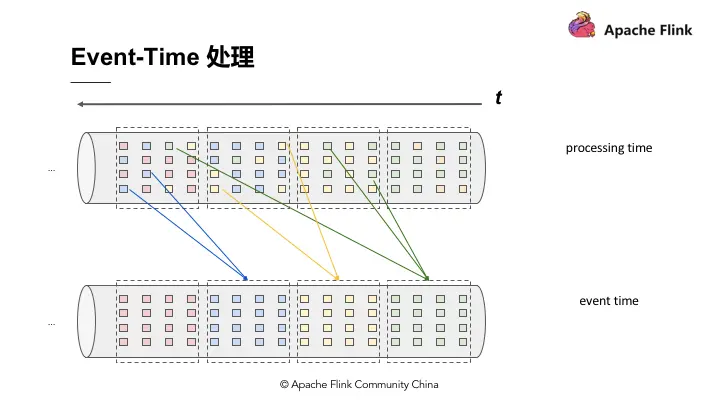 Event - Time 是用事件真实产生的时间戳去做 Re-bucketing,把对应时间 3 点到 4 点的数据放在 3 点到 4 点的 Bucket,然后 Bucket 产生结果。所以 Event - Time 跟 Processing - time 的概念是这样对比的存在。
