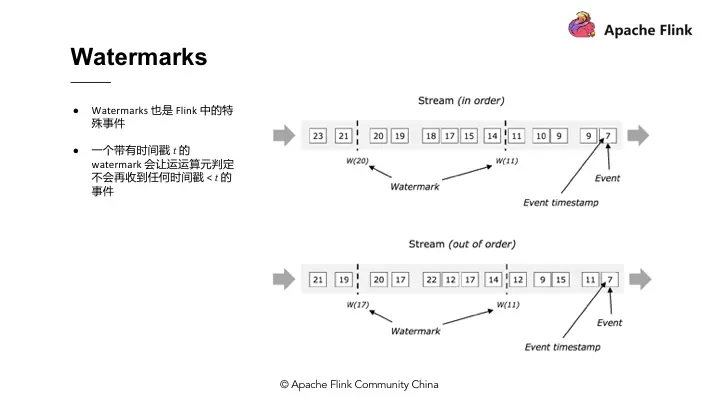 Flink 实际上是用 watermarks 来实现 Event - Time 的功能。Watermarks 在 Flink 中也属于特殊事件,其精髓在于当某个运算值收到带有时间戳“ T ”的 watermarks 时就意味着它不会接收到新的数据了。使用 watermarks 的好处在于可以准确预估收到数据的截止时间。举例,假设预期收到数据时间与输出结果时间的时间差延迟 5 分钟,那么 Flink 中所有的 windows Operator 搜索 3 点至 4 点的数据,但因为存在延迟需要再多等5分钟直至收集完 4:05 分的数据,此时方能判定 4 点钟的资料收集完成了,然后才会产出 3 点至 4 点的数据结果。这个时间段的结果对应的就是 watermarks 的部分。