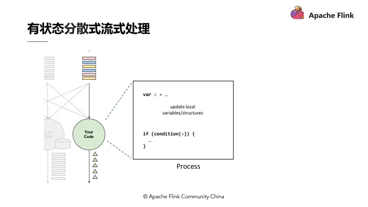 如图,上述代码中定义了变数 X,X 在数据处理过程中会进行读和写,在最后输出结果时,可以依据变数 X 决定输出的内容,即状态 X 会影响最终的输出结果。这个过程中,第一个重点是先进行了状态 co-partitioned key by,同样的 key 都会流到 computation instance,与使用者出现次数的原理相同,次数即所谓的状态,这个状态一定会跟同一个 key 的事件累积在同一个 computation instance。