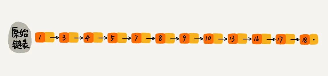 假如我们对链表每两个结点提取一个结点到上一级,然后建立一个索引指向原始结点,如下图所示。