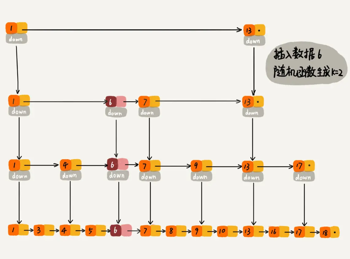 当我们往跳表中插入数据的时候,我们可以选择同时也将这个数据插入到部分索引层中。而插入到哪些索引层中,则由一个随机函数生成一个随机数字来决定。如果这个数字为 K,那我们就将数据插入到第一级到第 K 级索引中。