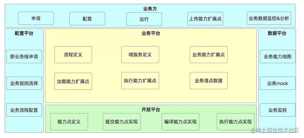 结合这张图看就会清晰很多,整体的业务平台架构比较清晰,分为开放平台、配置平台、业务平台和数据平台,一个新业务方接进来很简单,简单配置下就可以使用。