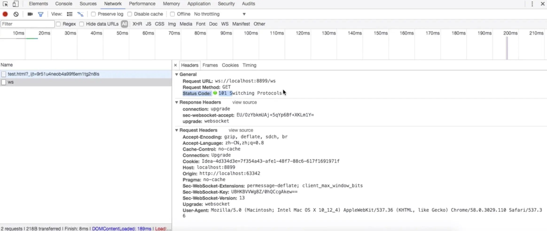 我们在浏览器中通过 F12 看看 Http 协议升级为 WebSocket 协议的过程。
