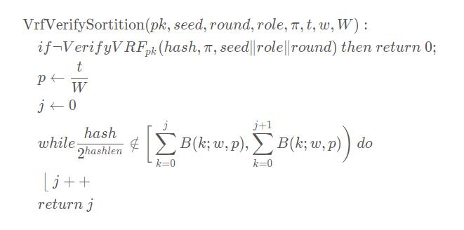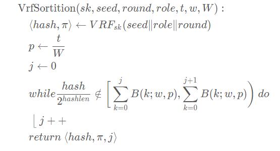 接下来,需要做的就是构造这个“伯努利试验”,这就用到了VRF。首先,要求每个参与者都拥有一对公私钥,然后,为了满足前面提到的要求,还需要定义一个种子seed,以及标识抽签阶段的一些数据,比如round。其中,需要尽可能让参与者在开始某一轮抽签的时候,才知道所用到的seed,这个根据具体的应用场景来定。