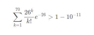 对于第一种场景,期望值 t 应该是比较小的,主要需要考虑的是,实际抽签结果 k 应该以很高的概率大于0,同时k又不应该很大。Algorand给出了一个值 t = 26,这时k在1到70之间的概率为: