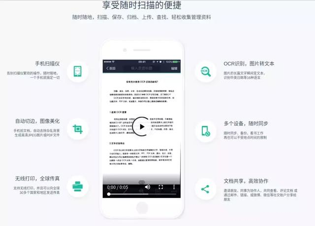 首先推荐简单介绍一下这款实用的app,扫描全能王,当然还有其他类似功能的产品。下图是它的一个主要功能介绍:
