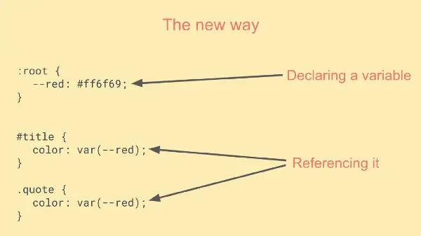 现在我们要使用 CSS 变量来改变应用程序的颜色。如果您以前没有接触过 CSS 变量,请快速查看下面的图片,因为它们总结了 CSS 变量的核心