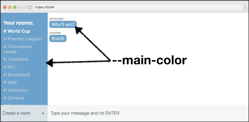 这些变量在整个样式表中重用了17次。但是,我们不需要遍历所有这些地方,让我们看看 ——main-color 是如何在消息框和左侧侧边栏中用作背景颜色的。