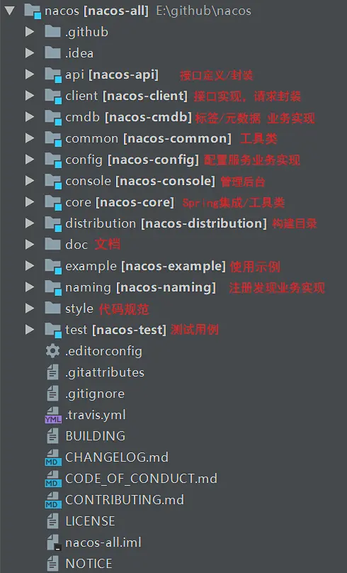 进入GitHub对应的页面,将NACOS工程clone下来。目录和文件看起来很冗长,但是对于看源代码真正有帮助的部分并不多。