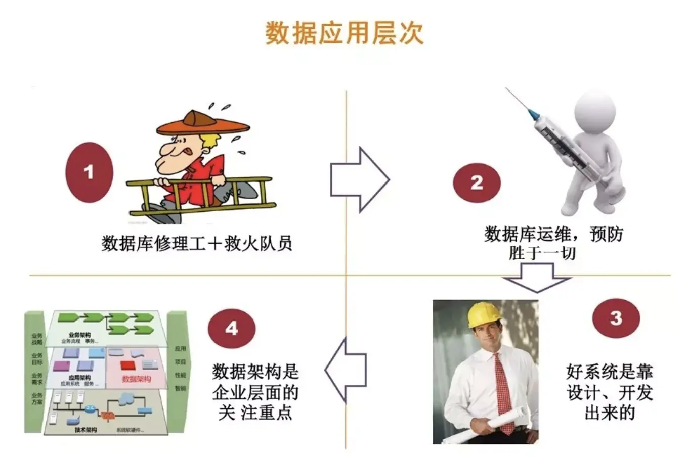 - 层次三,数据设计应用阶段,企业已不满足数据简单的"存取类"需求,而是从更高的应用角度,考虑如何提高整体数据应用水平。这个阶段会增加数据库架构、设计,加强业务端数据优化工作。表现为增加产品DBA的角色,加大数据库架构权重等。