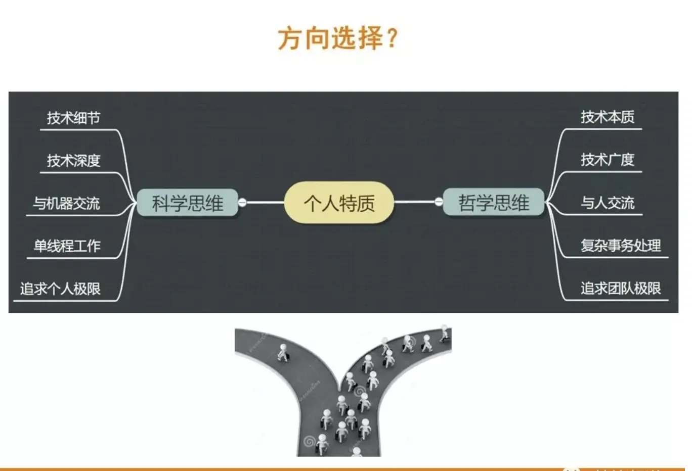 DBA职业发展,向上面临的第一个选择就是发展方向,是走管理路线还是技术路线。上图给大家描述了两种不同方向的区别,个人可根据自己特质,对号入座。这里要避免一个误区,就是"以管理为上",这其实就是官本位思想的体现。不是每个人都适合管理路线,放在不恰当的位置上,对人的发展是一种摧残。