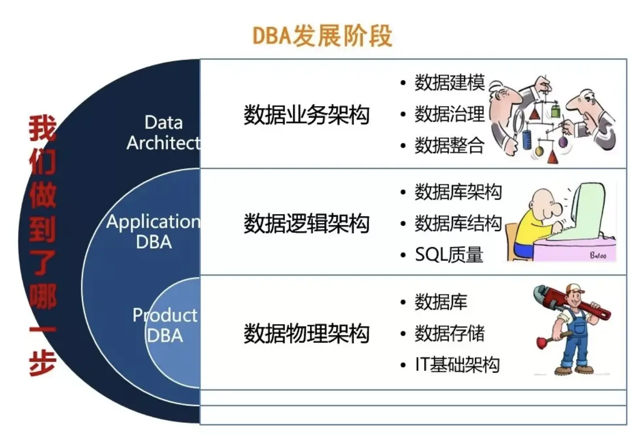 - 数据物理架构,对应为"运维DBA",工作重心为基础架构的建设。