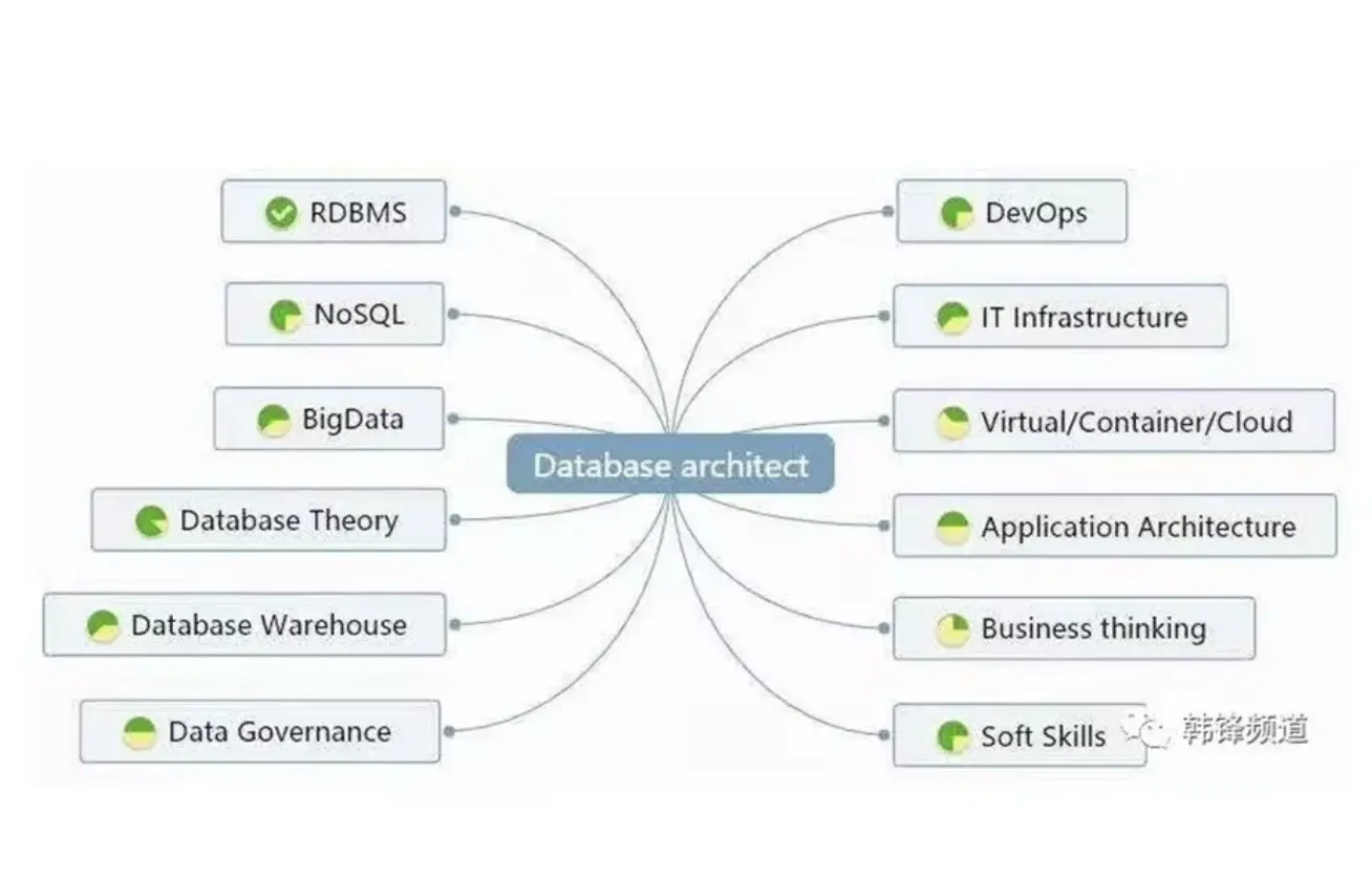 - 数据库架构师,这是一个相对综合类的职位。"架构"的含义比较模糊,各企业对架构师角色的定位也各不相同。一般能考虑设置数据库架构师角色的企业,都是有一定规模,企业内数据应用比较复杂的情况。下面根据我所在公司的实际场景,尝试给出一个数据库架构师的技能图谱,供各位参考。