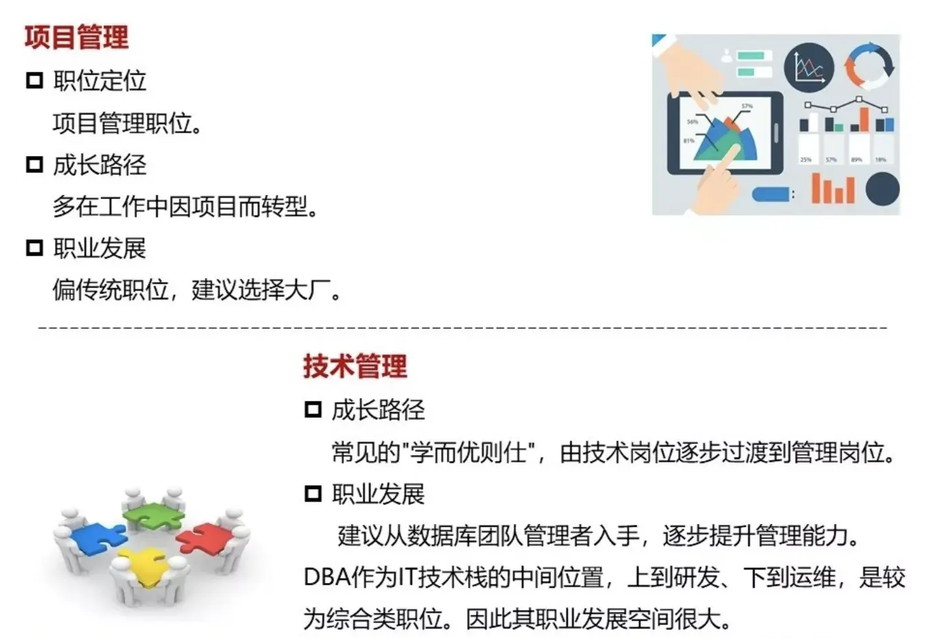 - 项目管理,DBA是一个比较综合类的职位,在沟通、协调、组织方面,与项目管理有相似在之处。因此,可以考虑转型做项目管理类职位。