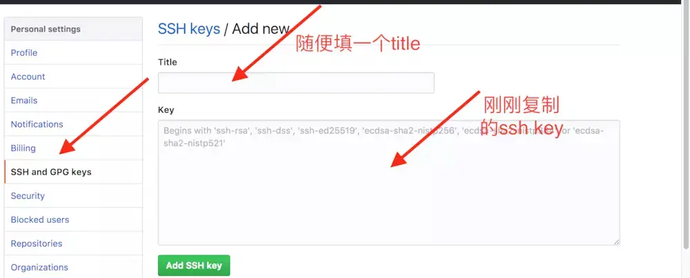由于这里我原来已经创建过,这里我选n,没有创建过的,会要求确认路径和输入密码,我们这使用默认的一路回车就行。成功的话会在~/下生成.ssh文件夹,进去,打开id_rsa.pub,复制里面的key。 终端查看.ssh/id_rsa.pub文件