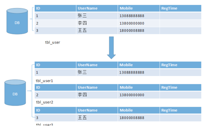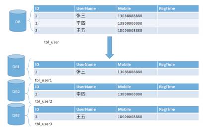 水平分库分表水平分库分表与上面讲到的水平分表的思想相同,唯一不同的就是将这些拆分出来的表保存在不同的数据中。这也是很多大型互联网公司所选择的做法。如下图: