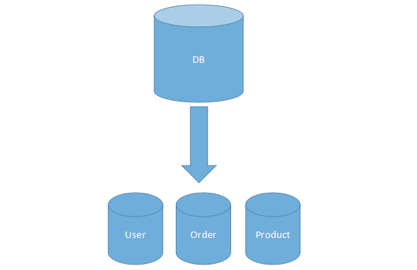 垂直分库垂直分库在“微服务”盛行的今天已经非常普及了。基本的思路就是按照业务模块来划分出不同的数据库,而不是像早期一样将所有的数据表都放到同一个数据库中。如下图: