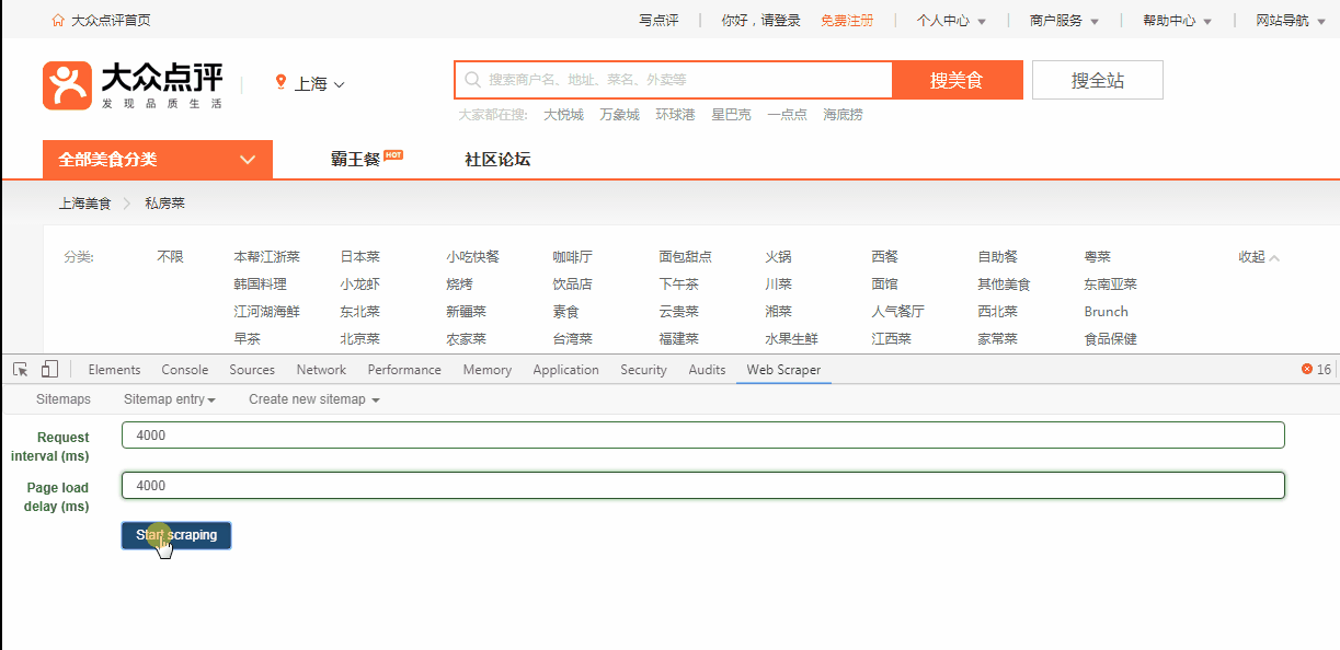 比如你要抓取点评网私房菜频道里的小店和点评评论。