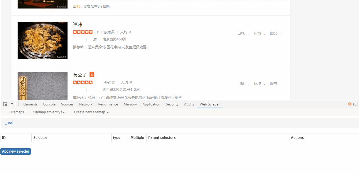 完全是可视化操作,Type里选择Link,Selector上选择Select,然后鼠标先选几下页面上的小店,自动把抽取小店url的xpath规则就写好了。点击Data preview可以检查和预览抽取规则是否生效。